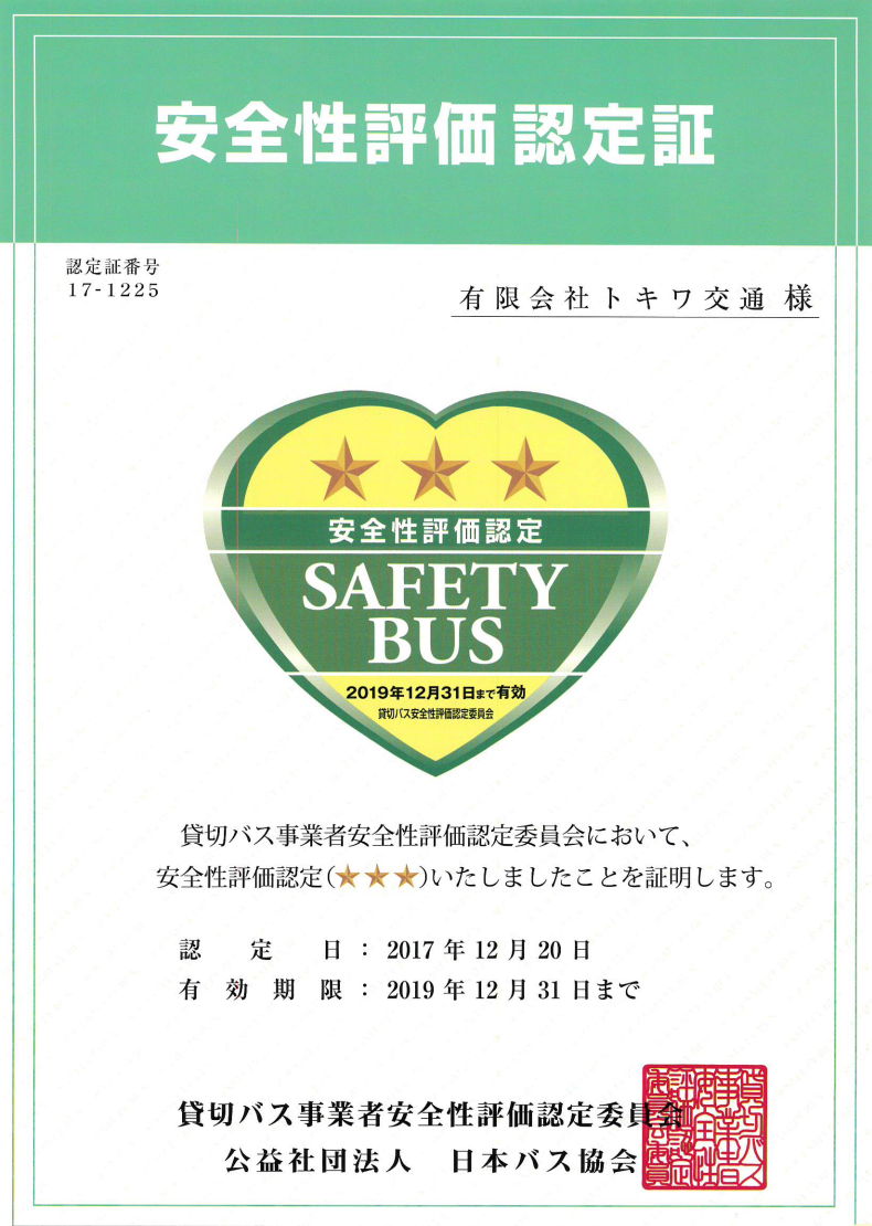 We ware certified the highest Three Star Safety Bus company. The list of certificated bus company around Japan is Here (Japanese).